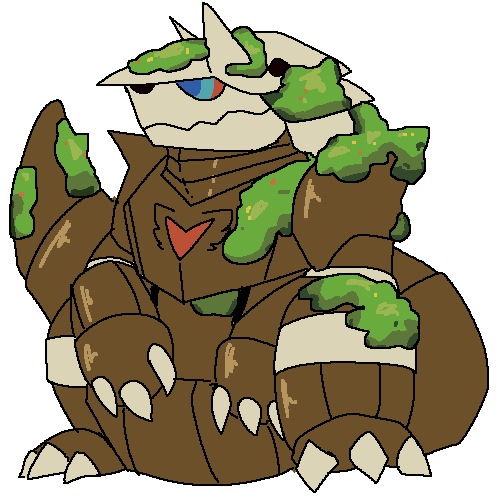 An ancient aggron, once the guardian of a massive mountain to the south, now practically retired, his old armor covered in moss in patches as he rests in the forest atop the mountain.